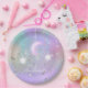 A pretty pastel color night sky with glowing stars and a glowing pink moon. Sprinkled with silver stars and cosmic glitter. Very cute and colorful design for girl's party or a baby shower. Personalize on back if you wish. In colors of purple, pink, yellow and teal.