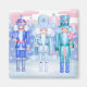 Three jubilant nutcrackers, bearing enchanted gifts of the winter season, don regal attire amidst a pastel-colored frost-kissed forest. Original illustration by artist Noël Snow.