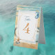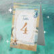 Elegant romantic oceanic coastal themed wedding reception table number sign. Soft pastel brown sand pale blue water with a sand dollar on the beach. Watercolor seahorse and starfish.