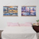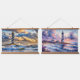 This coastal-themed design set showcases two distinct lighthouse scenes, capturing the ever-changing beauty of the Atlantic shoreline. One piece features a dreamy sunset behind the iconic Cape Hatteras lighthouse, painted in soft watercolor tones of lavender, blush, and cerulean, with gently rolling waves reflecting the warm glow of dusk. The second contrasts it with an intense seascape, where dramatic clouds churn over crashing waves and golden light filters through the storm. Together, these two visuals offer a stunning juxtaposition—tranquility versus tempest—making them perfect for displaying side by side. Ideal for anyone drawn to maritime landscapes, romantic skies, or nautical nostalgia, this set evokes the passage of time and the enduring strength of coastal sentinels. Whether styled in a beach-themed space or used as a focal point in a moody interior, these pieces convey both emotion and movement. AI generated artwork.