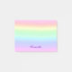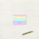 A pastel rainbow gradient, in ombre stripes, with purple font.
