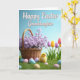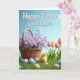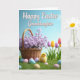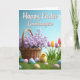 Designed with soft spring light, this card shows a calm outdoor scene on rich green grass under a clear blue sky. On the left sits a woven basket filled with small lavender, star-shaped blooms, their textured petals adding a gentle, caring touch 🌷. Across the foreground, pastel eggs in pink, blue, and lilac are scattered like a shared little treasure hunt between close friends. On the right, a tiny yellow chick stands alert with curious eyes and a small orange beak, as if leaning in for attention 🐰. In the background, tall cup-shaped flowers rise in pink, yellow, and deep violet, softly blurred to keep the focus on the sweet foreground details. A short greeting is placed near the top in a light, airy color, with a smaller line beneath it in a softer shade, balancing the open sky. The basket’s handle curves upward beside the lavender blossoms, and the pastel eggs cast faint shadows on the grass.
