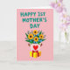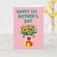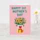 This Mother's Day card features a soft pastel pink background that feels gentle and affectionate, like a quiet thank-you shared between loved ones ❤️. Across the top, rounded teal lettering reads “HAPPY 1ST MOTHER'S DAY,” centered near the upper edge and easy to spot at a glance. In the middle, a pink tote-style container with small brown handles holds a full bouquet, and a red heart emblem on the front adds a sweet, caring touch. The flowers mix golden-yellow blooms with dark centers alongside tiny sky-blue clusters, with deep green leaves filling out the arrangement as if it’s been gathered with extra attention. Below the container sits a bright yellow gift box, placed low and centered, tied with a red bow that suggests a close, thoughtful bond. The simple shapes and cheerful color pairing keep the scene light and friendly, with a hint of romance in the way the heart and ribbon echo each other. 🌼 A red bow with looping tails rests on top of the yellow box near the bottom of the card.