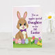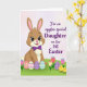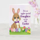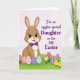 This card features a long-eared bunny character in warm brown with soft pink accents, standing front and center with a gentle smile and wide, friendly eyes 🐰. A deep purple bow at its neck adds a sweet, dressed-up touch, like it’s ready to greet someone special. The bunny stands on a bright green hill that slopes slightly toward the viewer, giving the scene a welcoming, close-up feel. Along the bottom edge, several egg shapes sit in a row, each decorated with pastel patterns like zigzags and plaid, suggesting a shared celebration. On the right side, two small fluffy yellow chicks huddle close together as if keeping each other company, tucked among tulip-like flowers with tiny bows 🌷. In the upper right, a large area of flowing magenta text is placed prominently, with the letters curving smoothly against the background. Behind everything, the backdrop fades from pale pink into white, and the flowers show soft petals and green leaves beside the chicks.