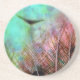 Pastel bubbles of aqua, turquoise, blue and pink and purple are a backdrop for these wispy peacock feathers