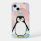 This charming illustration features a whimsical penguin centered against a backdrop of soft, overlapping semicircular hills. The palette is a gentle dreamscape of pastel pinks, lavenders, and mint greens, executed with a delicate watercolor texture that suggests a snowy, magical landscape. The penguin itself wears a cozy, patterned teal beanie, adding a touch of personality and warmth to the cool setting. Subtle gold leaf accents in the sky and on a floating celestial sphere provide a hint of fairy-tale elegance, blending minimalist character design with folk-art inspired patterns.
