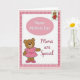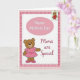 This card features a white rectangular panel centered on the front, surrounded by layered pink-and-white borders that feel sweet and affectionate ❤️. Just inside the edge is a deeper rose check pattern, and beyond it sits a pale pink frame dotted with soft white circles. Near the lower left, a friendly cartoon bear with warm brown fur smiles gently, wearing a light pink dress decorated with tiny hearts and small clover-like shapes, along with matching shoes topped by bows. The bear’s relaxed pose and cheerful eyes suggest a close, caring bond, like a warm hug in picture form. Near the upper middle, an oval sign with a dotted outline holds the main greeting in light pink lettering, while a second line of text sits to the right in a darker pink, flowing style. Up in the upper right corner, a smaller bear charm hangs as if from a string, dressed in a pink polka-dot outfit that adds a touch of friendship and fun 🌼. The background stays mostly white so the pink borders, the oval sign, and both bears stand out clearly against the soft patterned frames.