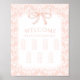 Explore sophistication with our elegant preppy baby girl shower seating chart sign poster, adorned with a charming pastel pink bow ribbon set against a backdrop of classic damask pattern. Perfect for welcoming guests to your celebration with style and refinement.