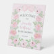 Elegant cute preppy baby girl shower welcome sign showcasing pastel pink watercolor floral wreath decorated with cute pink bow ribbon.