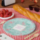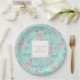Paper plates with a whimsical pattern. Pastel pink flamingos on a light green background. Green lily pads and lotus flowers. Cute tropical vibe.
