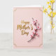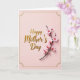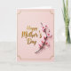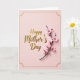 Designed with a soft pastel pink background, this Mother’s Day card feels gentle and affectionate ❤️. A warm gold double-line border frames the design, with smoothly curved corners that add a classic touch. On the left and center, the words “Happy Mother’s Day” appear in flowing gold lettering, standing out clearly against the pale backdrop. From the upper right, a slender flowering branch angles downward, as if leaning in to meet the message like a quiet gesture of care. The blossoms are light pink with deeper blush centers, and a few small buds sit nearby like little promises of more blooms to come 🌼. Dark, textured bark on the branch adds contrast and makes the petals look even softer by comparison. Soft, diffused lighting creates faint shadows around the letters and flowers, giving the design a gentle sense of depth. The gold text sits left-of-center while the pink blossoms cascade along the right side, balancing the layout within the warm gold frame.