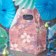This favor box features flowers and leaves in pastel shades of pink and purple on a pink background.