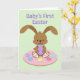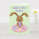 This card features a sweet brown bunny with long ears and rosy cheeks, drawn in a simple graphic style that feels friendly and affectionate 🐰. The bunny wears a light blue scalloped collar over a soft lavender outfit, and its tiny white feet rest on small pink heart shapes that suggest a tender, close bond. A little fluffy white tail peeks out with a small red heart detail, adding a gentle romantic touch without needing extra characters. The bunny sits centered on a soft pink oval platform, like a small stage set for a spring celebration. Around it are several decorated egg shapes in pastel blue, yellow, and purple, finished with easy patterns such as stripes and dots that feel light and festive 🌷. The background is a calm light green sprinkled with paler dots, keeping the scene airy and focused on the bunny. Near the top, a short greeting appears in rounded purple lettering, spaced neatly above the illustration. The eggs cluster loosely around the platform, with one tilted slightly and others upright, creating a balanced ring of pastel color.