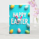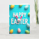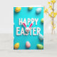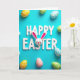 This card features a smooth aqua background with a large festive greeting centered in chunky, three-dimensional white letters, with gentle shadows that lift the text off the page. One letter is replaced by a cute white bunny with long ears lined in pink, a tiny red nose, and small dark facial details, giving the message a friendly, affectionate look 🐰. The greeting sits squarely in the middle, with the white lettering standing out strongly against the blue-green field. Around the words, pastel egg shapes in yellow, green, sky blue, and soft pink float like little gifts, creating a light, springtime setting 🌷. Each egg is decorated with neat white polka dots, some larger and some smaller, adding texture without crowding the layout. The lighting appears even and bright, so the raised letters and eggs cast soft, blurred shadows that suggest depth while keeping everything airy. The bunny’s face tilts slightly toward the surrounding shapes, as if sharing a quiet, friendly moment within the design. White polka-dotted eggs in pastel yellow, green, blue, and pink are scattered around the central white greeting on the aqua background.