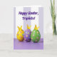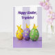 This greeting card features three decorated egg shapes arranged in a slight overlap across a deep lavender surface, like a small trio leaning close in friendly company 🐰. One egg is sunny yellow, one is rich purple, and one is fresh green, each covered with tiny pastel circles that look like little fasteners with pinhole centers, adding a textured, confetti-like pattern. A buttercup-yellow butterfly silhouette sits on top of each egg, wings lifted as if they’re about to flutter toward one another 🐇. Behind them, the background is filled with vertical stripes that alternate soft lavender and white, giving the scene a gentle, springtime rhythm. Near the top, a flowing line of text in deep violet is centered and stands out clearly against the lighter striped backdrop. The even, bright lighting makes the colors look smooth and the small circular details easy to notice, while the close grouping of the eggs and butterflies suggests a tender, affectionate togetherness. The final look is a neat row of three eggs—yellow, purple, and green—each topped with a yellow butterfly, set in front of lavender-and-white vertical stripes.