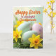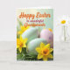 The front design shows three smooth, egg-shaped decorations in mint green and soft pink, nestled close together like friends sharing a quiet moment 🐰. Each egg has slightly darker round dots, giving the surface a gentle, textured look without feeling busy. They sit in a thick bed of fresh green, blade-like leaves that curl and overlap as if cradling the eggs protectively. Bright yellow, trumpet-shaped flowers rise around them, their warm orange centers drawing the eye and adding a hint of flirty warmth to the cool pastels 🌷. Two eggs appear sharper and nearer while the third sits a little farther back, creating depth like a small gathering in a garden. Across the upper area, a short greeting is placed above the scene in flowing lettering, colored in a warm gradient that shifts from orange into magenta. Soft, diffused light smooths the shadows, and the background stays gently blurred so the eggs, leaves, and yellow blooms stand out. The greeting sits centered near the top, while the mint and pink eggs rest below among the green leaves and yellow flowers.