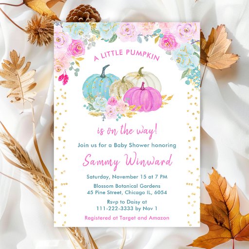 This cute and whimsical watercolor book request enclosure card features pastel pumpkins in blue, pink and gold, floral arrangements and gold confetti. The text combines handwritten script and sans serif fonts for a stylish and modern look. This is perfect for an autumn fall baby shower.