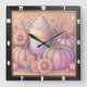 This enchanting square wall clock features whimsical pastel pumpkins in shades of pink, purple, and blue, alongside delicate sunflowers and a magical rainbow-hued drink topped with whipped cream. Adorned with sparkling stars and hearts, this delightful design brings a soft, ethereal, and cheerful autumn touch to any space.