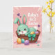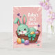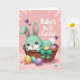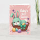 This design shows a stylized mint-green rabbit nestled cozily in a woven wicker basket, with big brown eyes, rosy cheeks, and a gentle smile that feels like a sweet hello between close friends 🐰. Its long ears rise up with soft pink inner details, and a small white tail peeks out at the back. A shiny teal-green bow is tied to the basket, adding a polished touch that draws your eye. Inside the basket and scattered near the bottom are decorated oval eggs in pastel golden yellow with stripes, pale aqua with tiny speckles, and light lavender with faint patterning. Small candy-like dots are sprinkled around the eggs, adding extra texture and a light, affectionate mood 🌷. The background is light pink with soft radiating lines and small purple heart shapes, giving the scene a gentle, close-to-the-heart feel. In the upper right corner, the words “Baby’s first Easter” appear in rounded white lettering against the pink backdrop. The teal bow sits near the basket’s front edge while the purple hearts float lightly behind the rabbit’s raised ears.