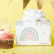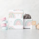 adorable pastel rainbow pattern, featuring soft shades of pink, green, yellow, and gray. Accented with hearts and delicate dots, this whimsical design is perfect for adding a touch of charm to baby rooms, playrooms, or any kid-friendly environment. The gentle pastel colors create a soothing atmosphere, while the fun rainbows and hearts evoke a sense of joy and wonder.