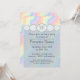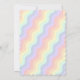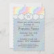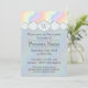 This invitation features lines of rolling waves that make a simple and fun pattern in a rainbow of pastel colors from pink to lavender overlayed by a semi-transparent layer of rain below a set of fluffy gray clouds. The middle cloud holds a monogram set above the rain section on the lower portion of the card where you can find sample text that can be customized to create a personalized invite for your event.