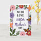 Designed with a tall, springtime layout, this card centers a lavender rectangular frame that feels like a gentle hug around the message. Inside the frame, the text reads “WITH LOVE sister ON Mother’s DAY,” with “WITH LOVE” and “ON Mother’s DAY” in dark lettering and “sister” standing out in a deep purple, placed neatly in the middle. Around the frame, clusters of flowers in soft pinks, warm oranges, deep reds, and muted purples mingle with leafy green stems, like a bouquet gathered for someone close ❤️. A pair of orange butterflies with black veining and tiny white speckles drift near the wording, as if circling back toward each other in a quiet, affectionate dance. Smaller winged insects add little sparks of motion between petals, giving the border a friendly, companionable feel 🌼. The background stays a pale teal wash that keeps everything light and airy without stealing attention from the center. Tiny pastel dots are scattered across the teal backdrop, like soft confetti floating behind the floral border.