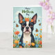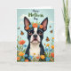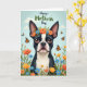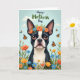 Designed with a sweet, romantic touch, this card features a black-and-white dog centered against a pastel blue sky, gazing forward with gentle dark eyes that feel like a quiet “I’m thinking of you” ❤️. A small crown of blossoms rests between its upright ears, mixing soft orange and calm blue petals with leafy green sprigs for a tender, cared-for look. Along the bottom, a meadow of stylized flowers spreads upward in orange, yellow, and blue, with slim green stems that frame the dog like a bouquet offered by a close friend. A few orange-and-black butterflies drift through the air, adding a light flutter that suggests shared moments and easy affection. Near the top, a short Mother’s Day greeting sits in the sky area in a dark, easy-to-read color, centered above the dog. Smaller accent text appears below it in a lighter tone, spaced neatly so the illustration stays front and center 🌼. Soft white clouds float in the upper background, rounded and airy against the blue.