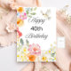 Celebrate a special 40th birthday with this elegant pastel floral greeting card. Featuring a soft watercolor design of delicate flowers and a charming bird, this card is perfect for conveying your heartfelt wishes. The scalloped edge adds a touch of whimsy, making it a beautiful keepsake for the birthday celebrant. The soft pastel colors create a serene and sophisticated atmosphere, perfect for a milestone birthday. Send your warmest wishes and make this 40th birthday truly memorable.