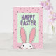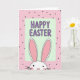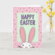 This card shows a friendly bunny peeking up from the bottom edge, its tall ears reaching toward the center as if leaning in for a sweet hello 🐰. The bunny has a white face outlined in dark lines, tiny dot eyes, a small pink triangle nose, rosy cheek marks, and thin whiskers that add a gentle, affectionate look. Behind it, the background is a soft powder-pink field sprinkled with small, dark round dots, giving the scene a light, cozy rhythm. Near the upper middle sits a pale green rectangle with rounded corners, like a little sign being held in place by the ears. Inside that panel, the greeting text is set in purple capital letters with rounded shapes, centered and easy to read. The mix of pink, pale green, and lavender-purple feels springtime fresh, like two friends sharing a warm glance across a garden path 🌷. The bunny’s ears frame the green panel while the purple lettering sits neatly in the middle, above the dotted pink backdrop.