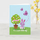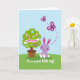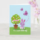 This card features a plump lavender bunny-like creature with pink-lined ears, rosy cheeks, and tiny white-padded feet, sitting calmly on a rolling green hill 🐰. Nearby, a rounded green tree leans in as if keeping it company, giving the scene a friendly, almost affectionate closeness. The tree’s canopy is dotted with ovoid decorations in soft pink, pale blue, and purple, like little eggs hanging in a gentle spring display 🌷. Across the middle of the tree, a white banner stretches horizontally with a seasonal greeting written in thick, dark lettering. Above them, two deep magenta winged insects sweep through the pale blue sky, their dotted flight path curving like a shared dance. Near the lower area of the design, a short message appears in small white lettering against the green foreground. The background stays simple with smooth pastel shapes, keeping attention on the bunny, the decorated tree, and the looping dotted trail overhead.