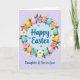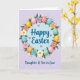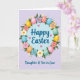 This design shows a circular spring illustration on a soft lavender background, with a pale blue center disc that reads “Happy Easter” in deep blue flowing lettering, with the words centered and easy to spot 🌷. Around it, a leafy green wreath forms a ring, dotted with pastel egg shapes in pink, yellow, light blue, and mint, plus one coral-red egg with white polka dots. The eggs vary in texture with a mix of smooth areas and light speckling, giving the ring a cozy, close-together feel like a shared keepsake. Tucked between the eggs are small flowers in ivory, blush pink, warm orange, soft purple, and sky blue, their petals layered so they look gently gathered like a bouquet. Tiny white florets and scattered small pink hearts add a tender, affectionate touch, like a quiet nod to friendship and family bonds 🐰. Near the bottom, the line “Daughter & Son in Law” appears in matching deep blue lettering, placed below the wreath and centered. The overall layout keeps the wreath evenly spaced around the middle disc, with green leaves filling gaps and the coral-red polka-dotted egg standing out along the ring.