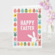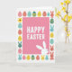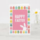This card features a salmon-pink rectangle at the center, setting a cheerful spring backdrop. In the middle, the words “HAPPY EASTER” appear in large white letters, stacked neatly and easy to read. Around the pink area, a border of pastel egg shapes in coral, teal, lemon yellow, and soft green creates a lively frame, with patterns like dots, stripes, and small floral accents. Tucked between the eggs are simple, round-faced animal heads with small ears and gentle expressions, giving the edge a friendly, companionable feel 🐰. Near the bottom-right of the pink center, a larger white long-eared bunny peeks in, angled slightly to the right as if leaning closer to join the moment 🐇. The flat colors and smooth shapes keep everything light and sweet, like a shared glance between friends during a spring gathering. The greeting stays centered in white while the decorative border wraps all four sides in soft pastels, and the bunny’s bright white head overlaps the lower-right corner of the pink field.