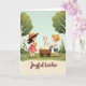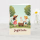 Designed with a springtime scene, two young children walk together across rolling green grass, their gentle smiles and close spacing suggesting an easy friendship. A fair-haired boy pushes a rustic wooden wagon while glancing toward a white rabbit 🐰 sitting inside, its pink-lined ears standing tall and a faint rosy tint on its cheeks. Beside him, a dark-haired girl in a coral-pink dress and wide-brimmed straw hat with a matching ribbon cradles a fluffy yellow duckling, holding it near her chest as if sharing a quiet moment. A second small duckling peeks out from the wagon, adding a sweet bit of motion to the little parade. Around them, scattered pink and orange wildflowers dot the grass, and pale tree trunks rise into rounded green canopies under a pale blue sky. The words “Joyful Easter” sit along the bottom in a flowing, dark-toned lettering style that stands out against the lighter ground, with a small 🌷 accent nearby. The wagon’s wooden slats and wheels are lightly shaded, and the rabbit’s ears show soft pink detail inside.