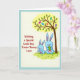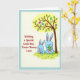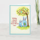 This card shows a sweet scene framed by a sky-blue border around a cream background, where two young rabbit-like characters sit close together 🐰. They’re drawn in soft light blue with pink inside their ears and gentle rosy cheeks, and their body language feels like quiet friendship. The larger one cradles a green, striped egg while the smaller companion leans nearby as if watching with fond attention 🐇. To the right stands a simple tree with a brown trunk and green leaves, surrounded by a soft yellow glow that warms the scene. Hanging from the tree are five patterned eggs in magenta, bright blue, orange, green, and purple, adding a festive touch without crowding the space. A few small tufts of green grass sit near their feet, keeping the setting outdoors and calm. On the left side, a short greeting appears in warm red lettering, placed to balance the characters and the tree. The tree’s ornaments are evenly spaced, each ovoid shape clearly outlined against the pale background.