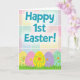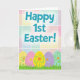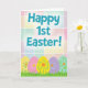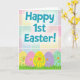 This card features a tall layout with rounded teal text centered near the top, set in thick, friendly lettering with a slightly soft texture. Behind the words sits a grid of pastel squares that fade gently into one another like morning light, moving through pale pink, soft yellow, light blue, and mint. The bright, airy background sets a sweet, close-to-you mood, like two friends leaning in to share a quiet smile 🌷. Along the bottom third, a band of green grass stretches across the card, adding a grounded, outdoorsy setting. Rising from the grass are five egg-shaped decorations in pastel yellow, pink, and lavender, arranged side by side like a small group keeping each other company 🐰. Each egg has its own simple pattern, including flower shapes with orange centers and curling green lines that feel like little gestures exchanged between companions. The teal message stays clearly above the eggs, while the grass and eggs form a cozy foreground against the softly glowing pastel mosaic. The lower edge is filled with layered green blades, and the eggs show floral icons and curling tendrils outlined in contrasting greens and warm orange dots.