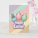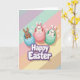 This greeting card features three stylized rabbits popping out of egg-shaped shells, arranged on a gentle diagonal as if they’re leaning toward one another like close friends 🐰. One bunny with warm brown fur peeks from a sky-blue egg, while two white bunnies rise from soft pink and mint-green eggs, each with rosy cheeks and wide, friendly smiles that seem shared between them. Small white sparkles dot the scene like tiny starbursts, adding a light, celebratory touch without crowding the artwork. The background is filled with broad diagonal pastel stripes in soft pink, lavender, mint, peach, and mellow yellow, creating a springtime setting that feels calm and sweet 🌷. Near the lower portion of the design sits a seasonal greeting in rounded white letters outlined in deep purple, standing out clearly against the pale stripes. Subtle shading gives the eggs a slightly three-dimensional look, and the bunnies’ ears tilt in different directions to keep the scene lively. A soft, diffused glow highlights their faces and the curved tops of the eggs, emphasizing their gentle expressions. Scattered white starbursts float around the bunnies and across the pastel striped background.