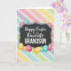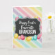 This greeting card features a central dark gray plaque with a scalloped edge and a chalkboard-like texture, setting a cozy, affectionate tone. The main text sits centered on the plaque, with “Happy Easter” in a flowing cursive style and “to our Favorite GRANDSON” in uppercase, simpler lettering beneath it in a light cream color for strong contrast. Around the plaque, decorative egg shapes in fuchsia, sunny yellow, teal, and peach curve in close, as if gathering in for a friendly hug 🐰. Each egg shows small pattern details like swirls, dots, and fine lines, and one smaller peach egg includes a tiny animal silhouette that adds a sweet, caring touch. The eggs overlap and peek from behind the plaque’s edges, creating the look of a lively group clustered together 🐇. Behind everything, broad diagonal stripes sweep across the background in soft pastel pink, lavender, pale yellow, and sky blue with a gentle painted texture. The glossy eggs catch light against the muted plaque, while the pastel stripes fade softly from corner to corner.