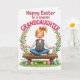 This card shows a sunny illustration of a young girl with light blond hair tied back with a bright pink bow, smiling with her eyes gently closed as if savoring a sweet moment. She sits cross-legged on a simple wooden bench, arms open wide like she’s ready for a hug, wearing a white shirt, a gray buttoned vest, and relaxed blue trousers. Above her, a leafy green arch curves overhead with small blossoms in pink, yellow, and soft blue, setting a springtime scene 🌷. The open-armed pose and the calm, content expression give the picture a tender, affectionate tone, like a friendly welcome or a caring family embrace. Beneath the bench, fresh green grass holds several decorated oval eggs in pastel blue, pink, green, and orange, each with stripes and small patterns 🐰. Near the top of the design, a warm greeting appears in curving red letters, centered above the girl and framed by the foliage. The bench slats are lightly shaded, and the pastel eggs show neat lines and tiny details against the bright green ground.