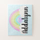 Personalize with child's name for a fun gift perfect for any occasion. This puzzle features a blue sky background with a colorful, pastel watercolor rainbow design complete with heart and clouds.