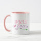 Cute Fun Pastel Witch Hocus Pocus Halloween Broomstick Mug, Enjoy your holiday with this cute spooky funny personalized Halloween mug. The stylish typography design features "Hocus Pocus" wording purple and pastel pink, start and green witch broomstick, pink witch, in white background.