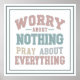 Looking for a bold and calming Christian print that reframes anxiety with prayer for your home office, prayer room, or kitchen wall? "Worry About Nothing — Pray About Everything" is set in a strong pastel collegiate all-caps typographic layout — dusty rose, soft teal-blue, warm sand, and blush — on a clean white background with a double teal border frame, echoing the heart of Philippians 4:6 where Paul instructs believers to be anxious for nothing but instead bring everything to God in prayer with thanksgiving, making it a practical and powerful daily declaration for any space where worry tends to show up first, as well as for other persons, events or devotional settings. Available on wall posters, ceramic mugs, tote bags, unisex t-shirts, and vinyl stickers — each carrying the simple but life-changing instruction that prayer is the answer to every anxious thought. Contact the designer via the Message button for adjustments.