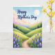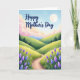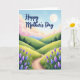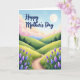 Designed with a gentle, storybook-style landscape, this card shows rolling green hills and a winding dirt path that leads the eye toward soft blue mountains in the distance. The sky shifts from pale blue overhead to a blush-pink band near the horizon, with puffy clouds drifting like cotton. In the upper right, a glowing full moon hangs quietly, adding a tender, watchful presence that feels like a caring gaze ❤️. Along the path, fine blades of grass frame the scene, while clusters of lavender and periwinkle flowers rise in spiky bursts, like little bouquets offered with affection 🌼. Across the upper sky, the words “Happy Mother’s Day” appear in a flowing indigo style, centered and easy to spot without covering the main view. Deeper green trees sit in the midground to give texture and depth between the hills and the far mountains. The foreground flowers are painted in cool purples and blues, with soft highlights that make the petals stand out against the grassy edge of the path.
