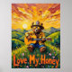This imaginative artwork showcases a bear, a true "Pastoral Pickin'" performer with a firefighter helmet and sunglasses, captivatingly playing an acoustic guitar in a field of wildflowers. A sun-kissed valley and rolling hills form the picturesque backdrop, with a jar of honey nearby. The vibrant, textured impasto creates a powerful and whimsical atmosphere, making this "Love My Honey" scene truly unforgettable.