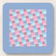 An attractive cork-backed coaster or table mat, with a pattern of patchwork in pink and blue denim colours, with a blue border, from a handpainted watercolour design by Judy Adamson.