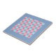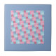 An attractive tile, for use as a trivet, with a pattern of patchwork in pink and blue denim colours, from a handpainted watercolour design by Judy Adamson.