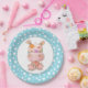 Cute patchwork hippo birthday plate with white on blue polka dots.