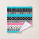 Patchwork made of multi-colored strips of fabric in pink, blue and black and white.