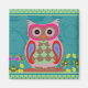 Multi-colored, cute polka dot patchwork owl stood on a flowering tree branch with an ornate blue background and green polka dot borders.