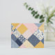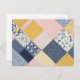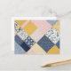 A pretty postcard with a patterned design in patchwork style. The print combines yellow, blue, pink and white sections with ditsy florals.