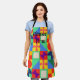 This apron has a Bauhaus design of squares with odd shapes inside, repeated across the design.